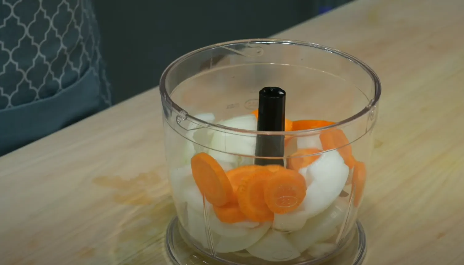 양파 1개, 당근 50g 을 믹서기에 넣고 입자가 있게 갈아줍니다.