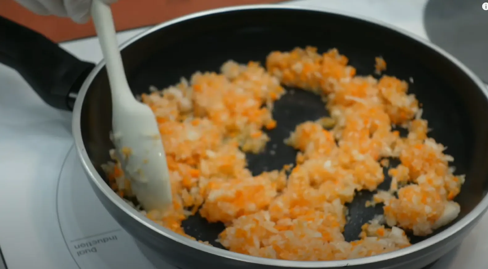 식용유 1큰술을 팬에 두르고 갈아진 양파와 당근을 수분이 없어질 때까지 볶습니다. 양파와 당근을 볶아줌으로써 고기양념에 빠지지 않는 설탕을 생략할 수 있습니다. 수분이 없을만큼 볶아주고 펼쳐서 식혀주세요.