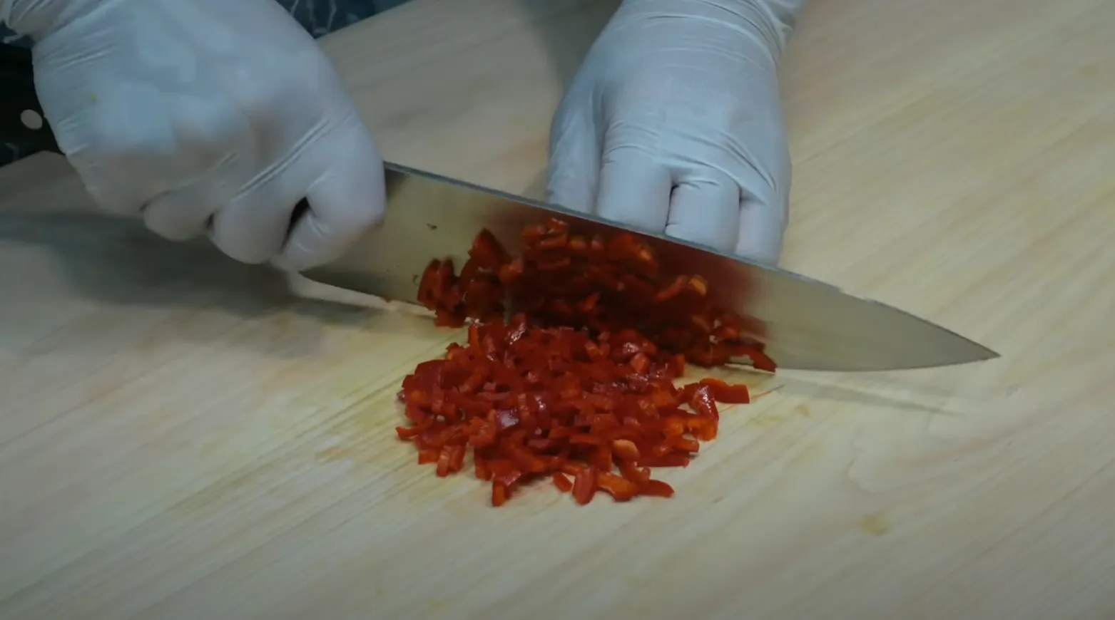 씨가 제거된 홍고추 2개를 준비해서 잘게 썰어서 준비해 둡니다.