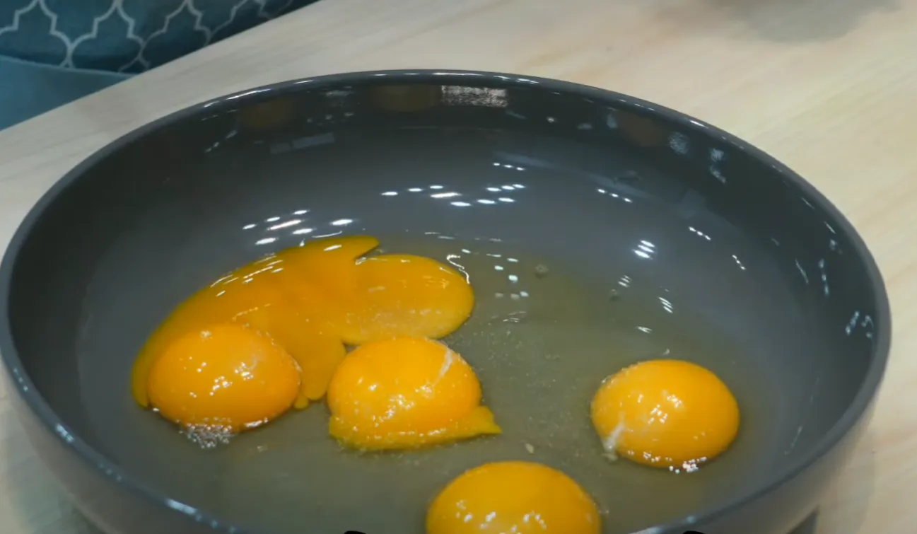 계란 2알과 아까 분리해 둔 노른자 3알, 그리고 맛소금 2꼬집을 넣은 후 잘 풀어서 준비해 두도록 합니다.