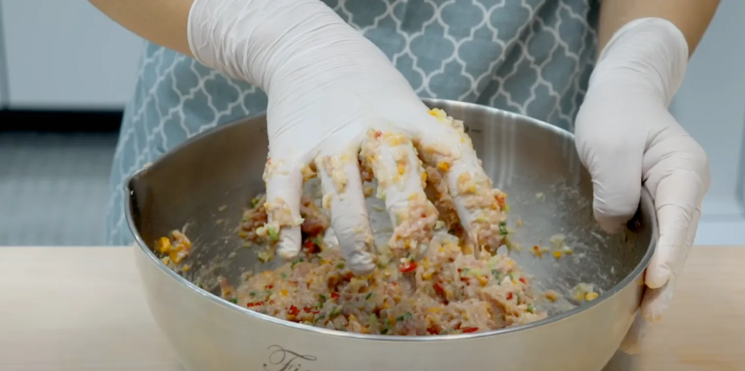 다짐육, 양파와 당근, 쪽파, 홍고추, 마늘 1/2큰술, 맛술 2큰술, 찹살가루 5큰술, 참치액 1큰술, 계란흰자, 맛소금 약간, 들기름 1큰술, 후추 톡톡5번을 모두 넣은 후 한쪽방향으로 저어가면서 고기의 결이 풀어질때까지 많이 많이 버무려 줍니다.