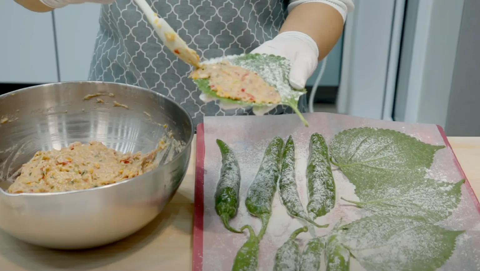 고기소는 가볍고 얇게 깻잎위에 올려주세요.